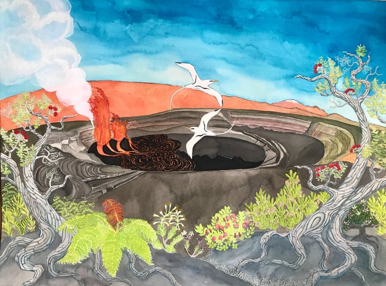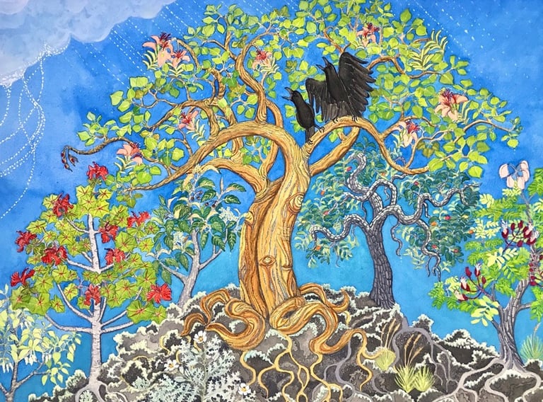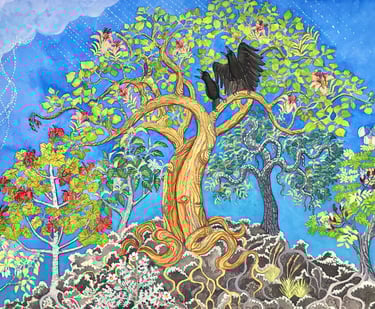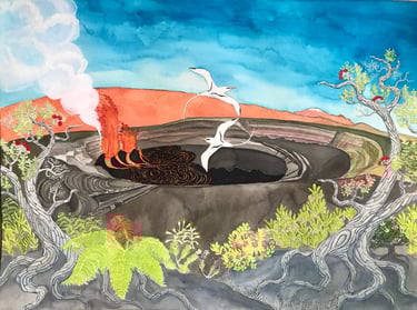 This painting is a prayer for pure, living, life-giving, gentle rains to drench the parched soils and native plant roots of Hawaiʻi Island....featuring a pair of ʻalalā (Hawaiian crows) and amazingly resilient native dryforest plants...